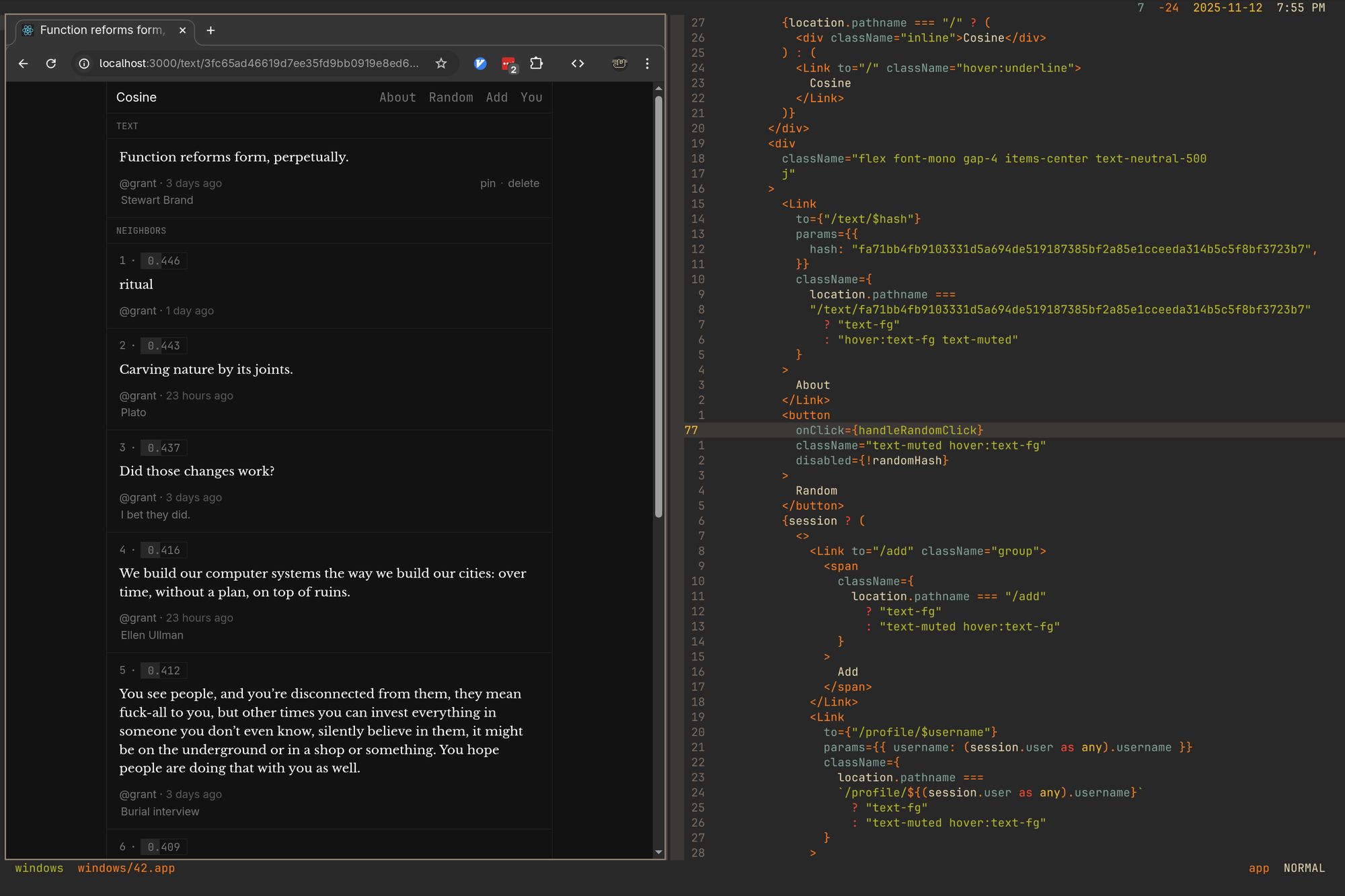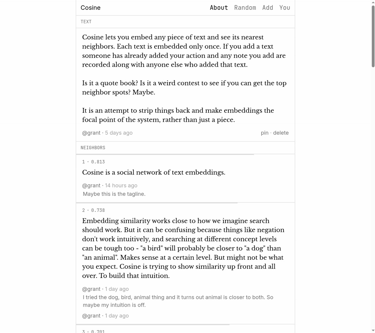 Cosine - embed and hash any text and see its nearest neighbors