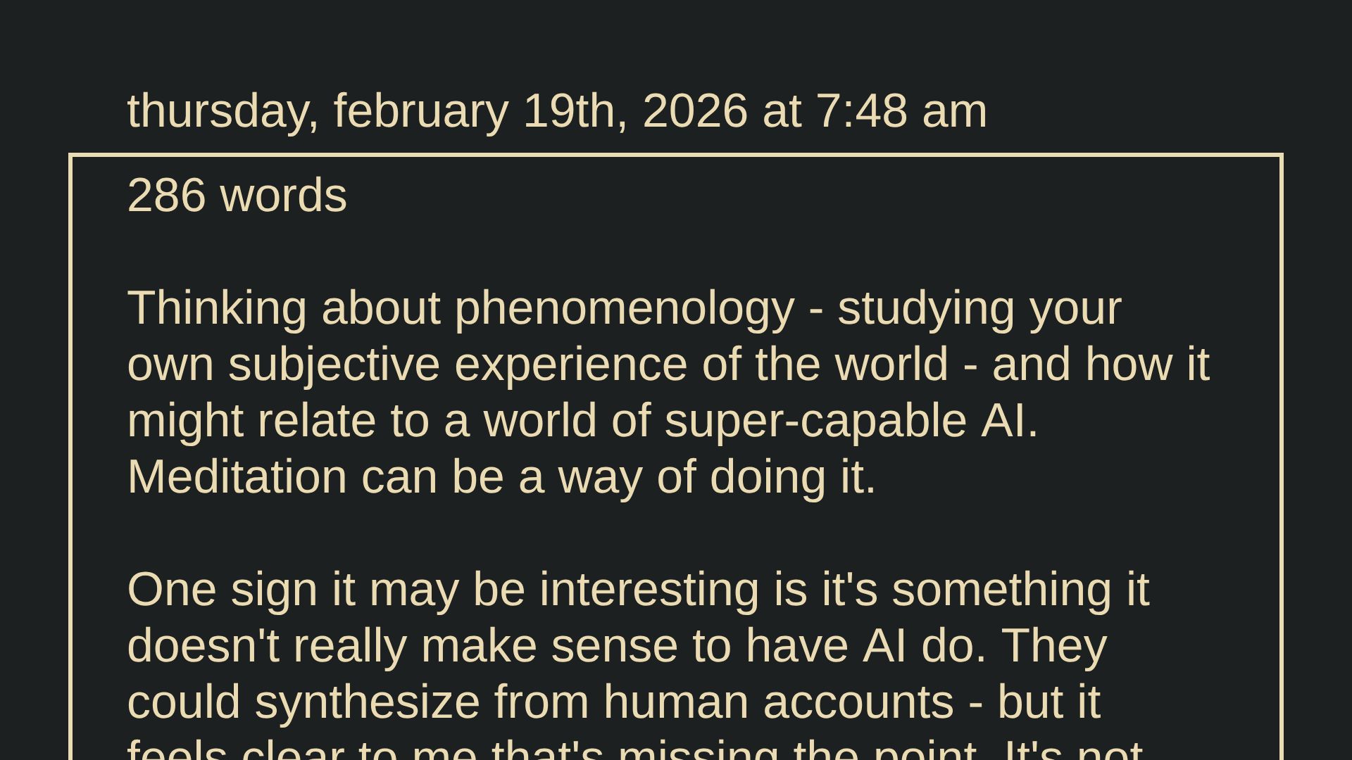 Thinking about phenomenology - studying your own subjective experience of the world - and how it might relate to a world of super-capable AI. Meditation can be a way of doing it. read on scrawl