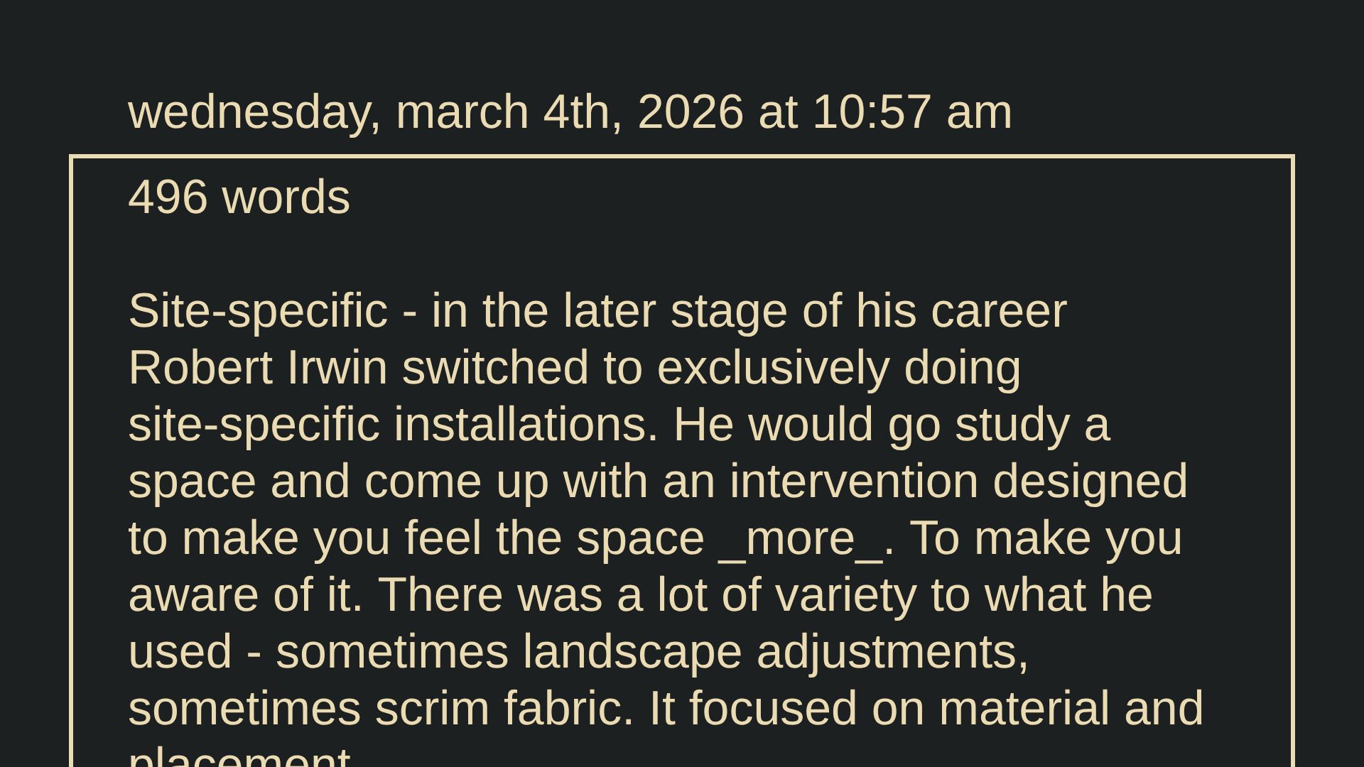Site-specific - in the later stage of his career Robert Irwin switched to exclusively doing site-specific installations. He would go study a space and come up with an intervention designed to make you feel the space more. To make you aware of it. There was a lot of variety to what he used - sometimes landscape adjustments, sometimes scrim fabric. It focused on material and placement. read on scrawl